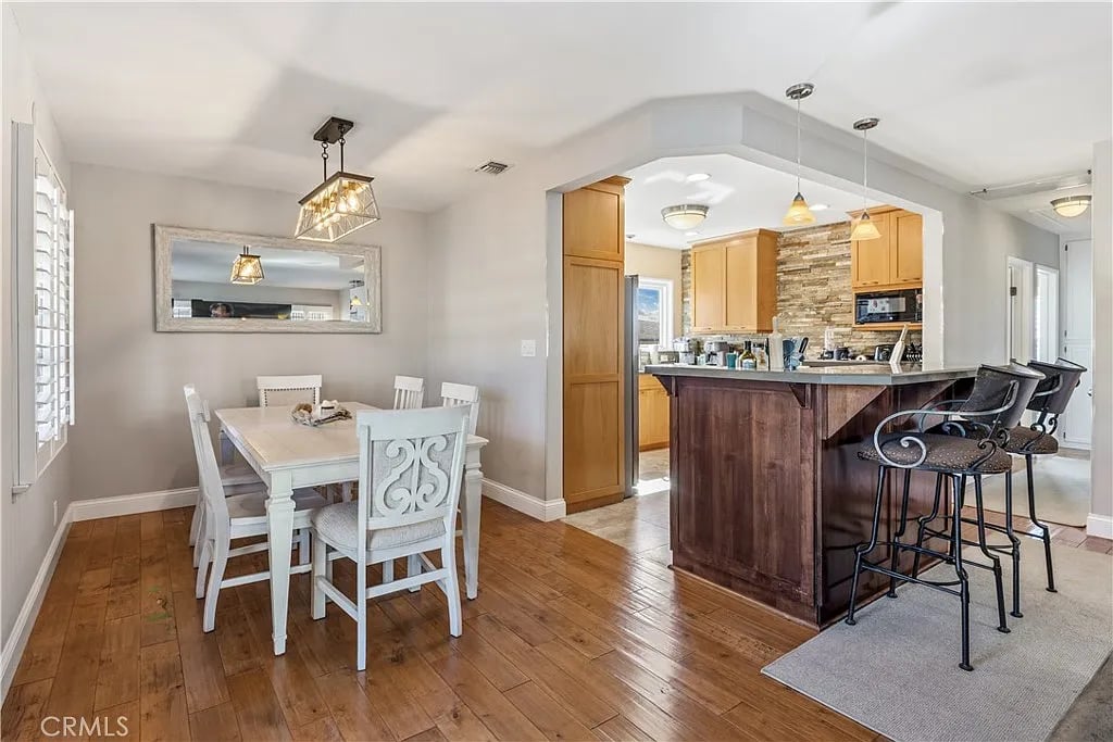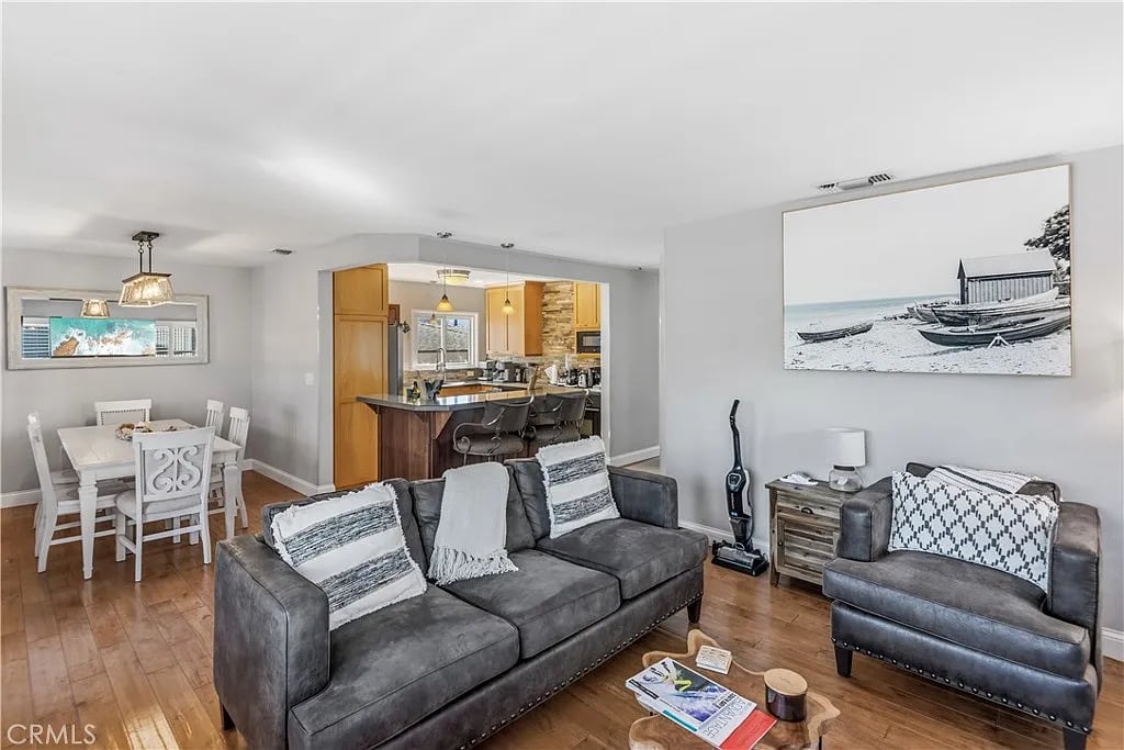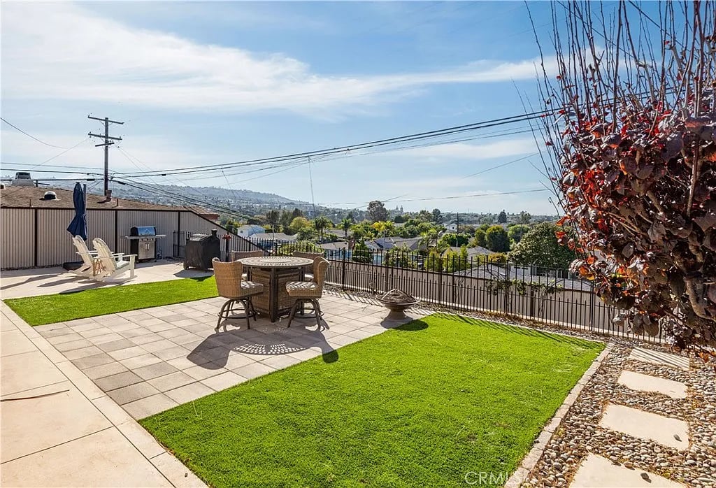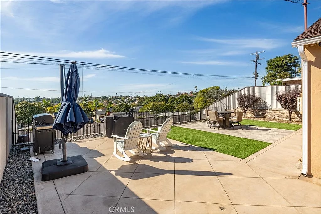 Inside, discover an open-concept floor plan that seamlessly integrates the living and dining rooms, leading to a beautifully designed kitchen. This kitchen is complete with an island/breakfast bar, Caesarstone countertops, and custom cabinetry. The bathroom is tastefully remodeled. The large rear yard boasts a large entertainment patio that is perfect for gatherings, offering panoramic vistas.